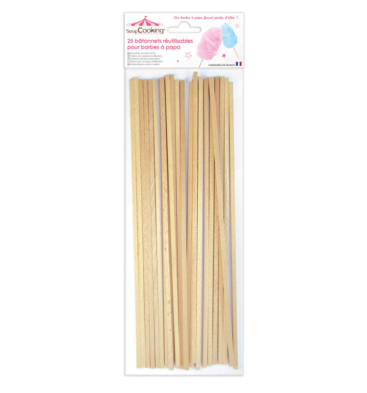 Ces bâtonnets en bois sont des supports idéals à la réalisation de vos barbes à papa maison ! A utiliser avec l’Atelier Barbe à Papa